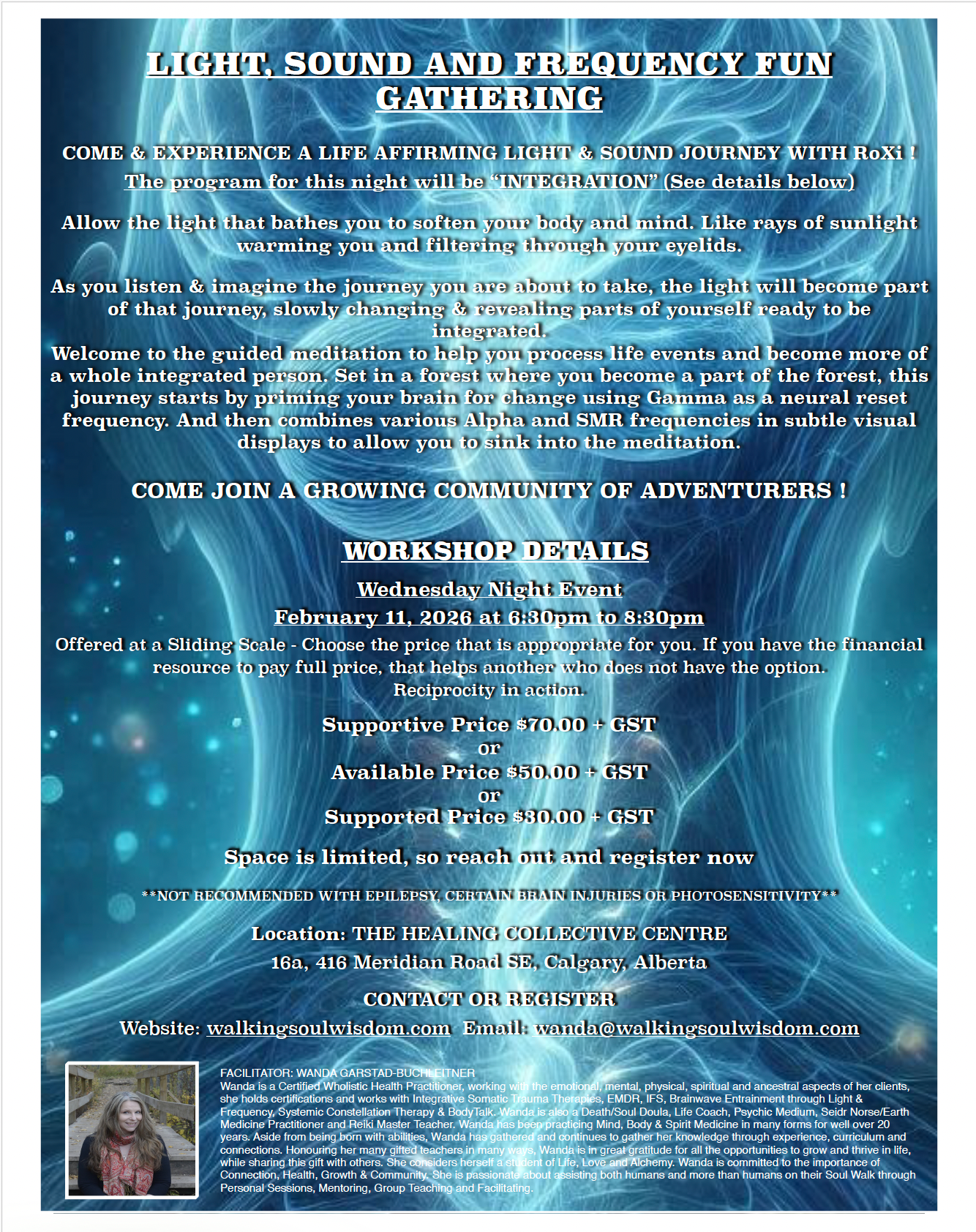 For more information, to book an appointment, to buy a roXiva device, attend or organize a group event, click the link above or contact Wanda by email at wanda@walkingsoulwisdom.com or by phone 403-702-2811.